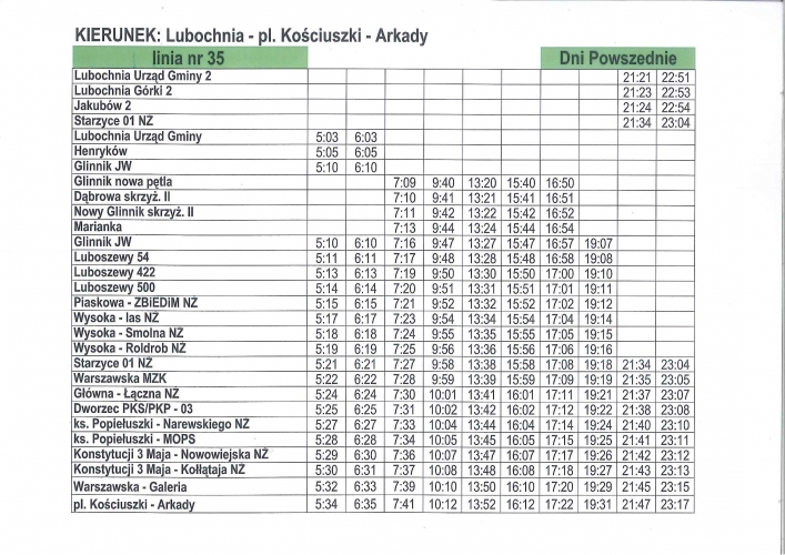Aktualne rozkłady linii nr 35 Od poniedziałku - 2 lipca 2018 r. wprowadzone zostaną korekty w rozkładzie jazdy komunikacji linia nr 35. URZĄD GMINY LUBOCHNIA INFORMUJE: OD PONIEDZIAŁKU - 2 LIPCA 2018 R. WPROWADZONE ZOSTANĄ KOREKTY W ROZKŁADZIE JAZDY KOMUNIKACJI LINIA NR 35. powrót