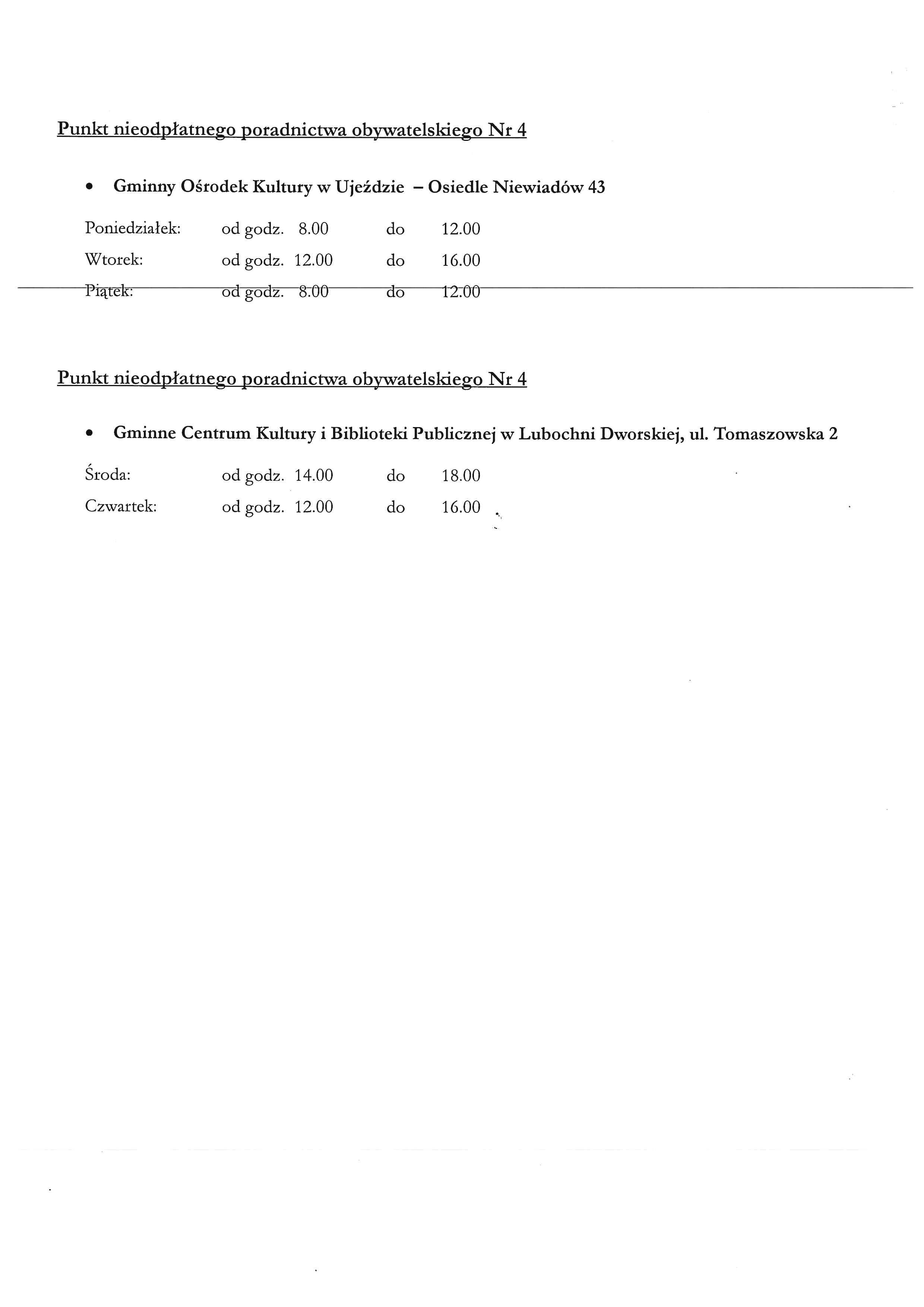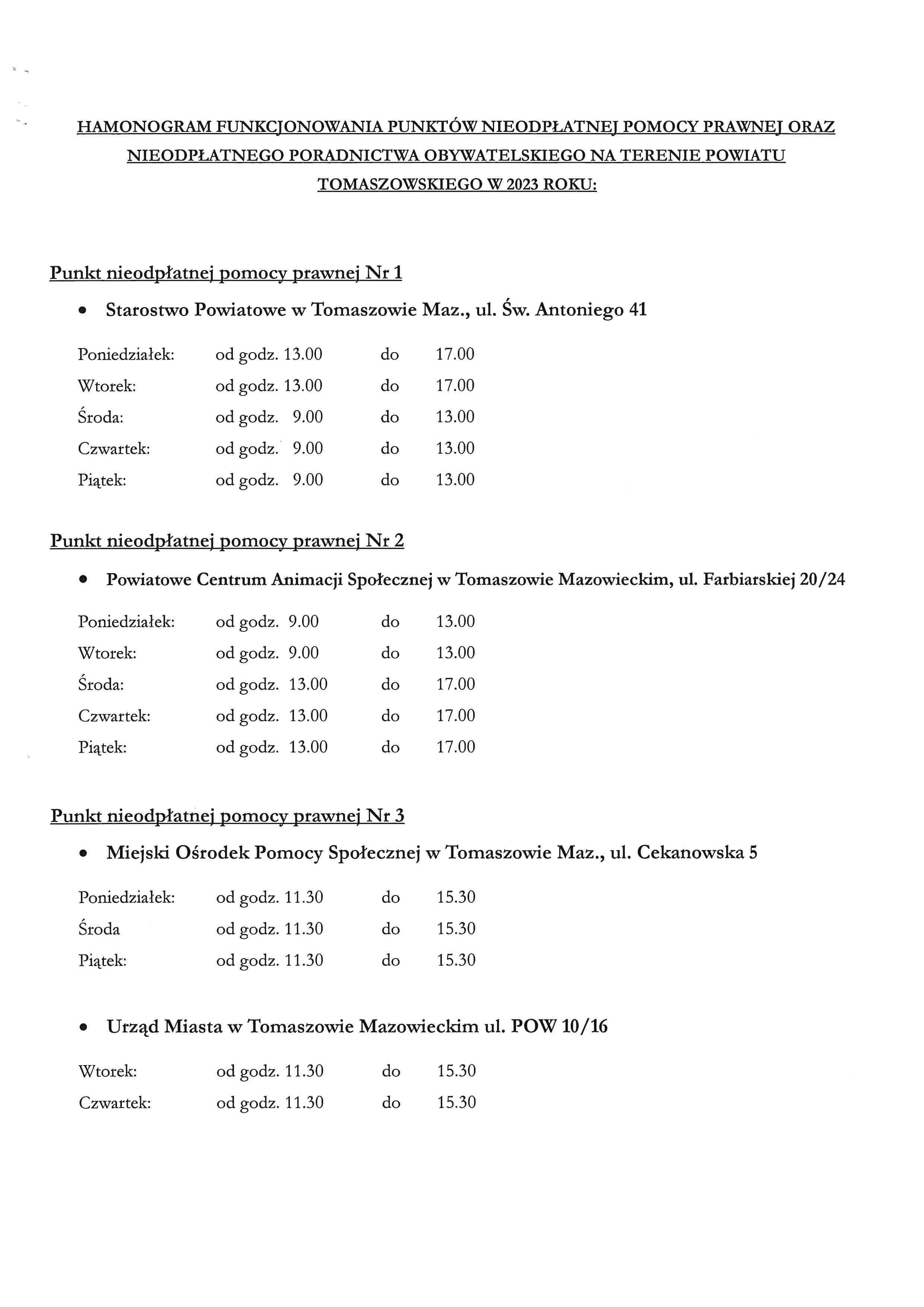Harmonogram funkcjonowania punktów nieodpłatnej pomocy prawnej