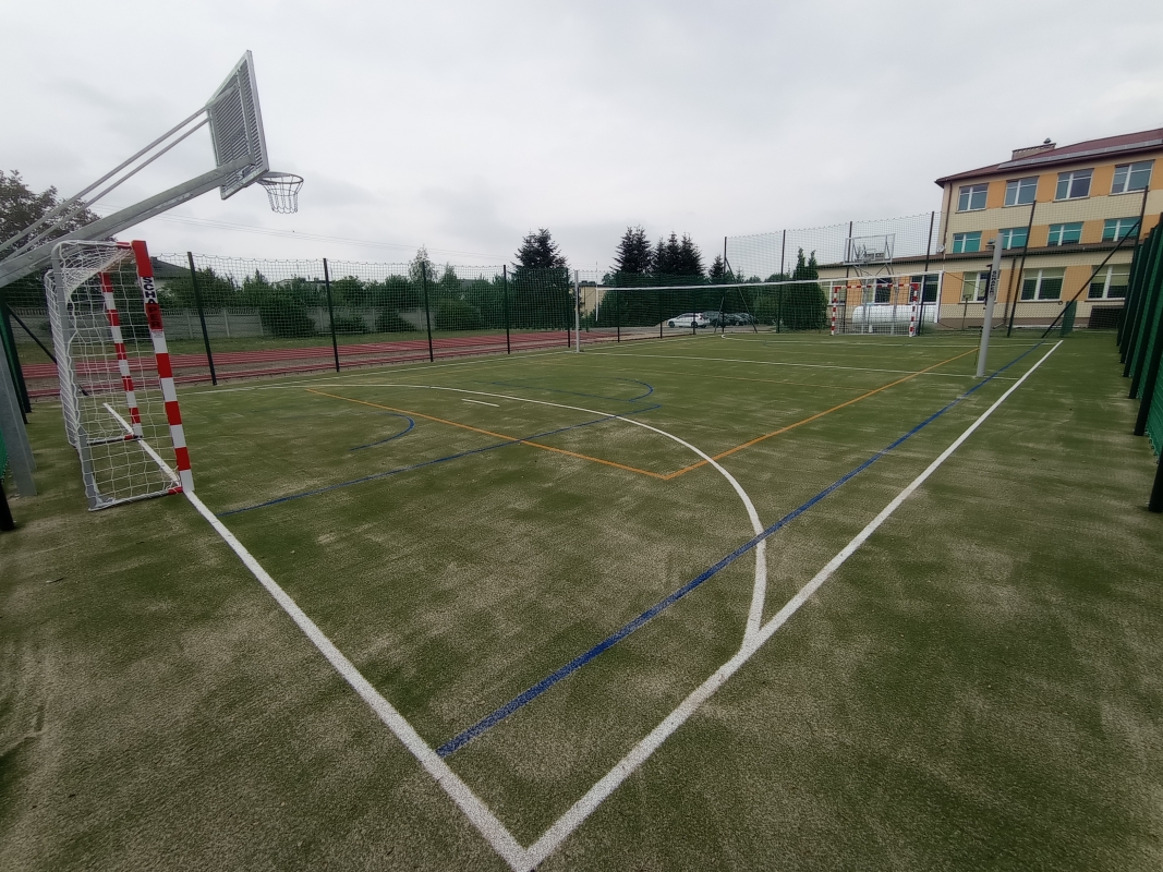 2. Nawierzchnię z trawy syntetycznej wraz z malowaniem linii farbami chlorokauczukowymi – boisko do piłki ręcznej, koszykowej oraz do siatkówki.