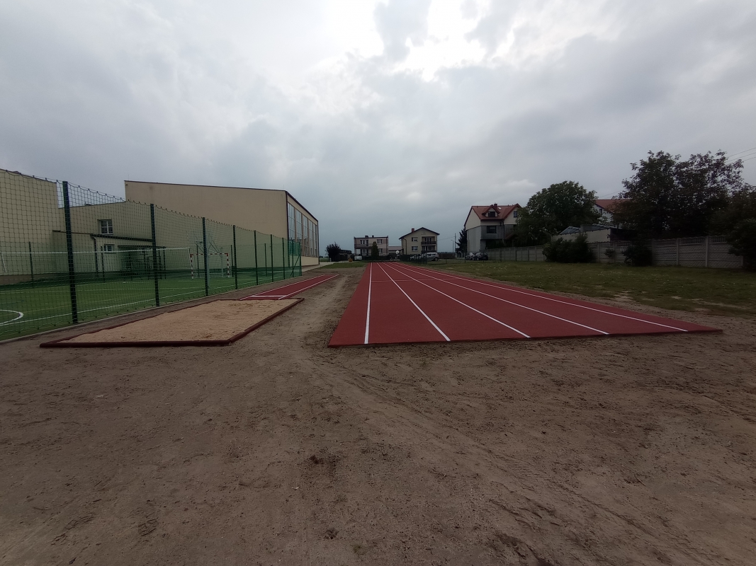 4. Skocznię w dal - podbudowa betonowa, nowa nawierzchnia syntetyczno-poliuretanowa  EPDM wraz z malowaniem linii farbą chlorokauczukową oraz montaż listwy wraz z belką do skoku w dal.