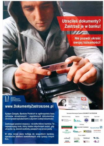 Kampania obejmuje promocję Systemu DOKUMENTY ZASTRZEŻONE w aspekcie korzyści i bezpieczeństwa osób, które utraciły dokumenty tożsamości. Informujemy o tym, że istnieje możliwość uniknięcia szeregu przykrych konsekwencji mogących powstać w wyniku utraty dokumentów.