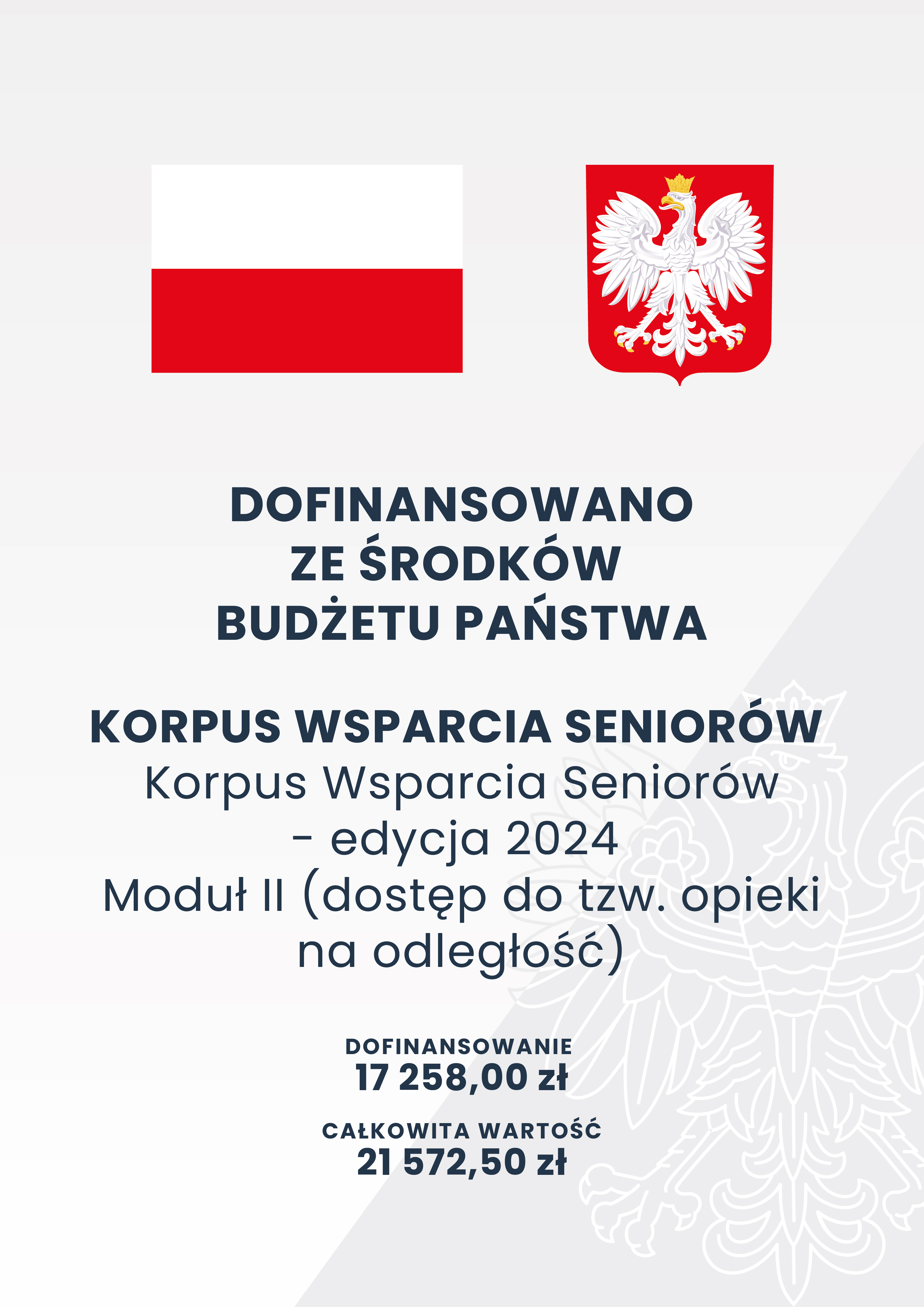Program Ministerstwa Rodziny i Polityki Społecznej "Korpus Wsparcia Seniorów" na rok 2024 - Moduł I i Moduł II jest realizowany przez Gminę Lubochnia we współpracy z Gminnym Ośrodkiem Pomocy Społecznej w Lubochni.