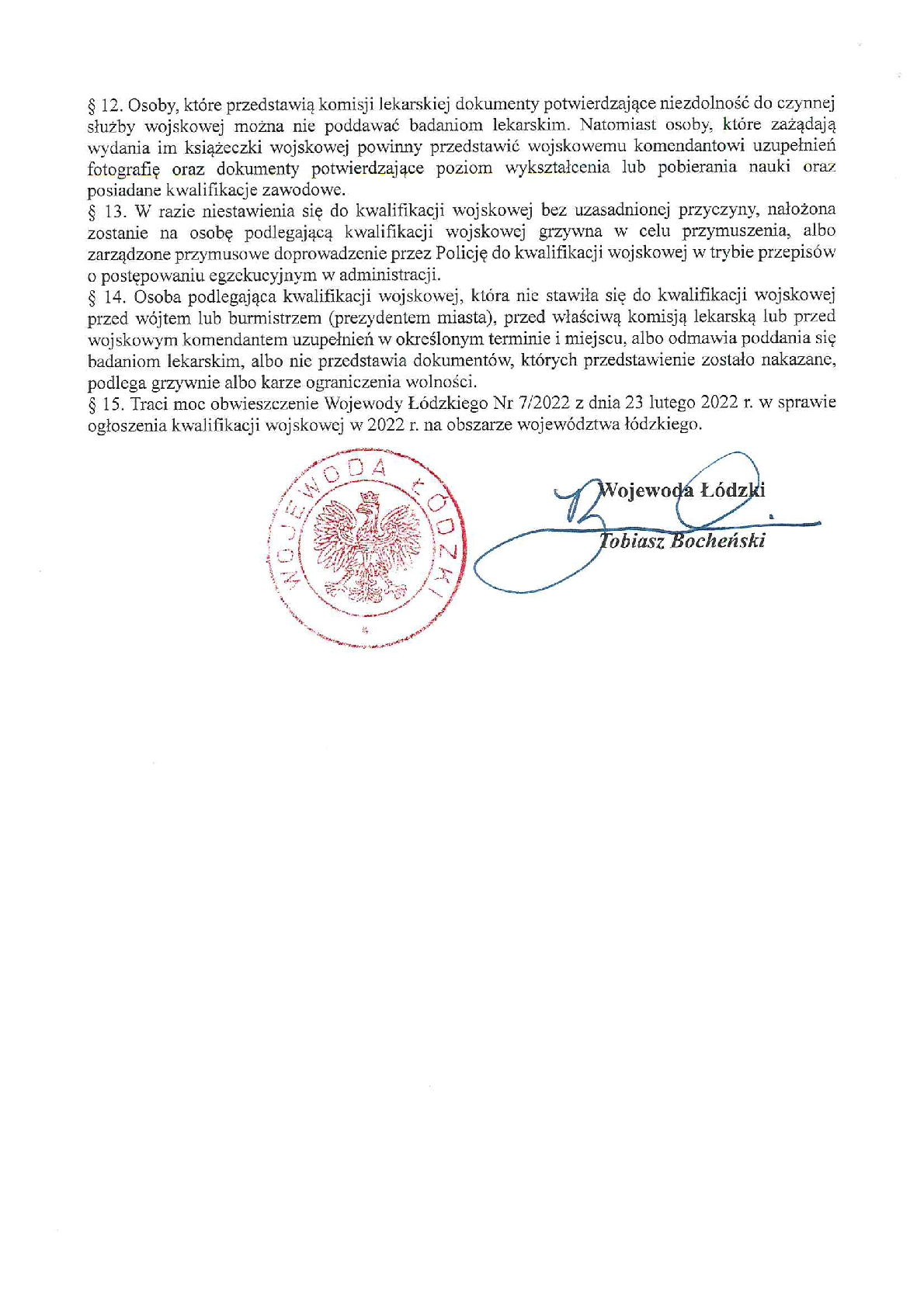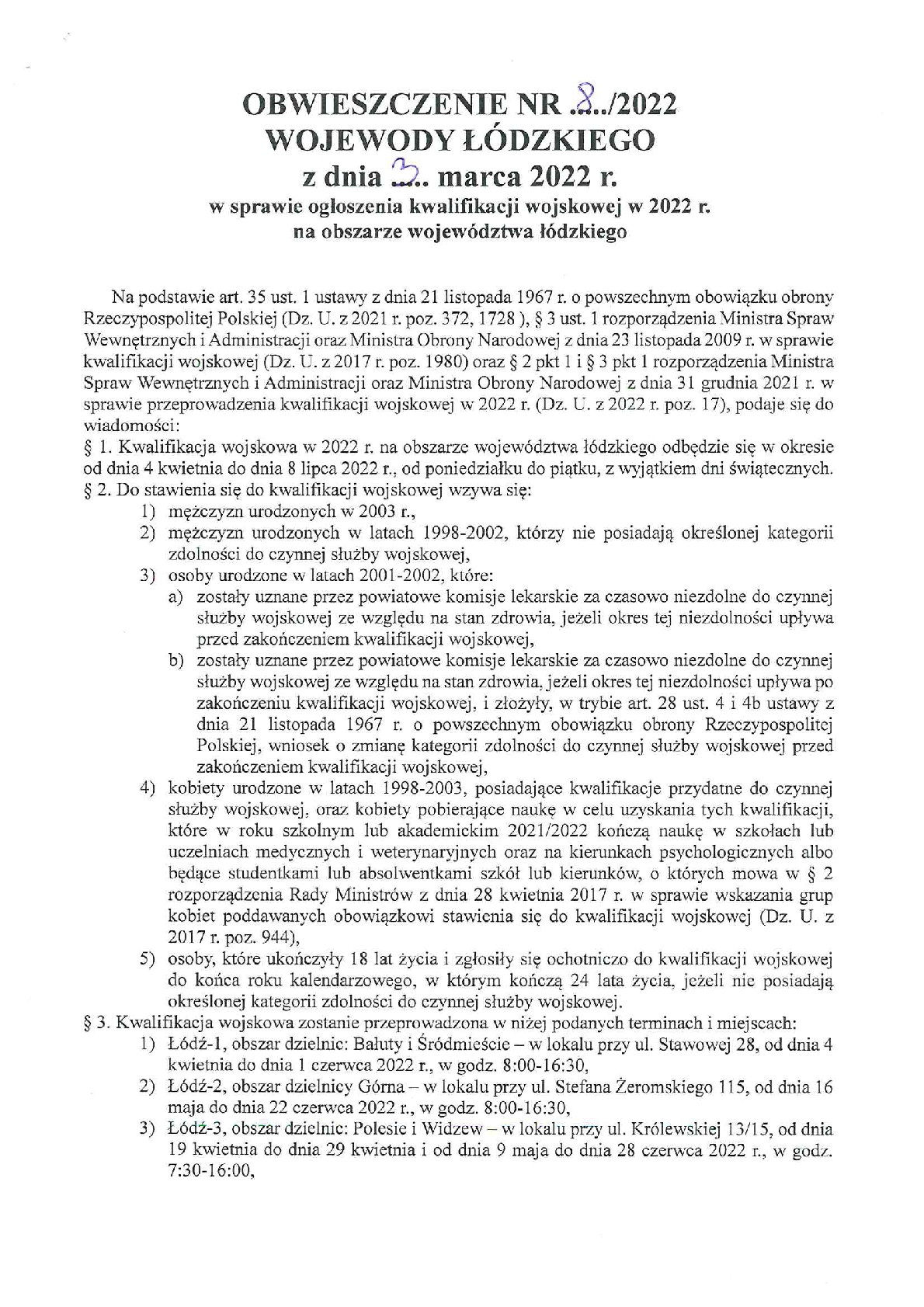 Kwalifikacja wojskowa 2022 - obwieszczenie wojewody Do pobrania Obwieszczenie 8-2022 z 3.03.2022 1.21mb powrót