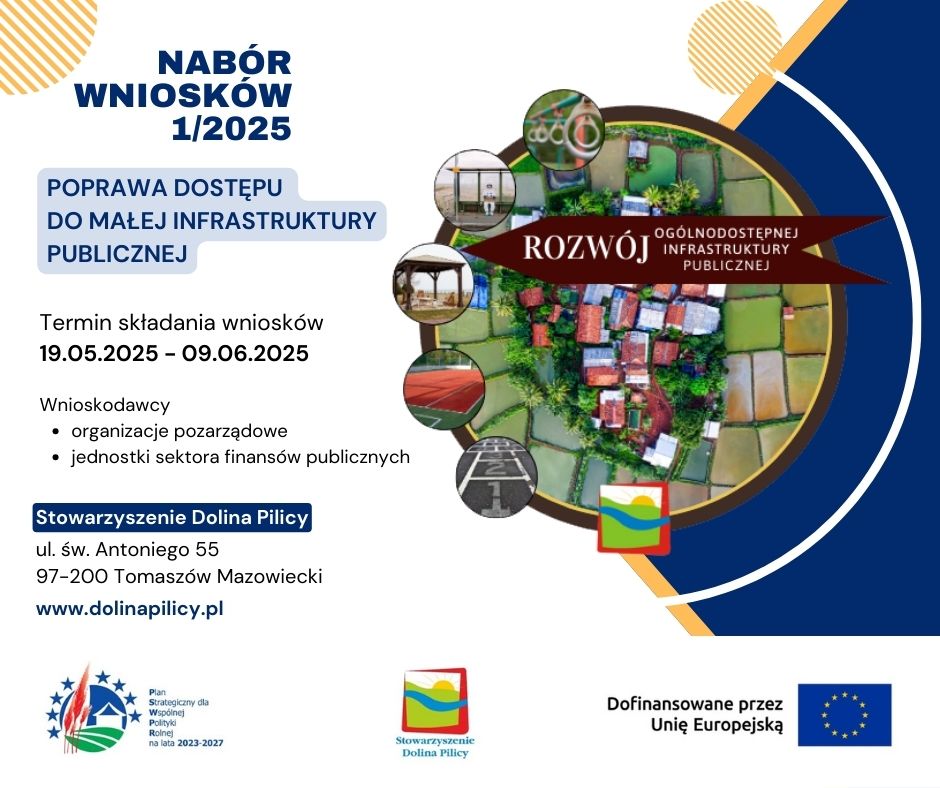 Ogłoszenie o naborze wniosków o wsparcie w ramach Poprawy dostępu do małej infrastruktury publicznej organizowane przez Stowarzyszenie Dolina Pilicy, dostępne jest pod linkiem