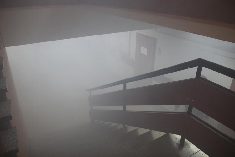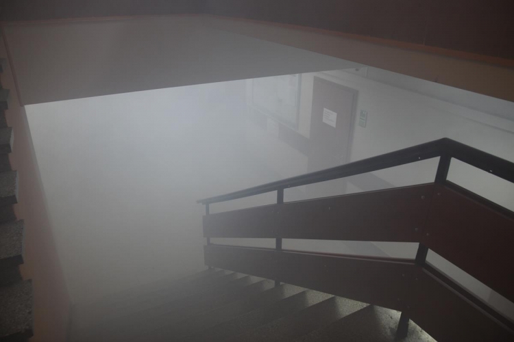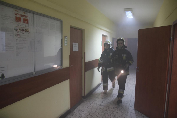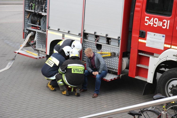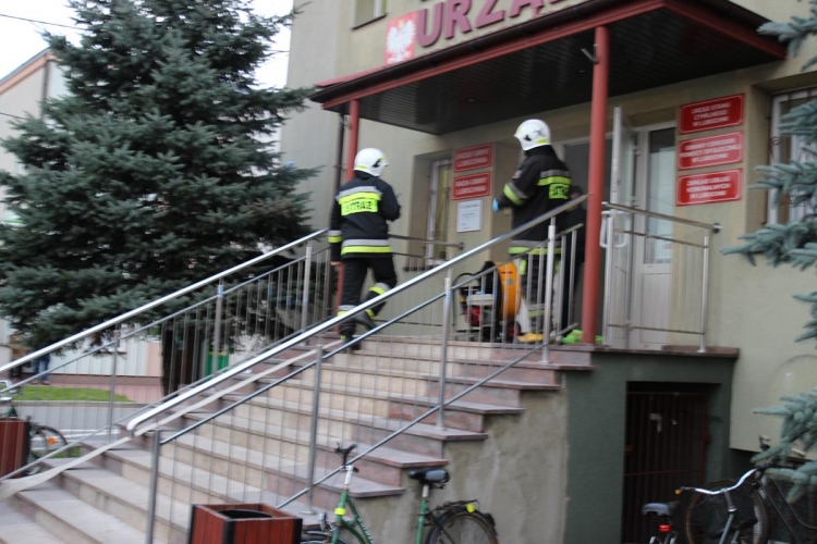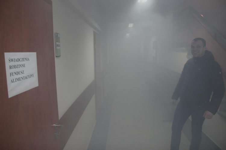 Wójt Gminy zostaje powiadomiony przez pracownika o zadymieniu, które ten zauważył na korytarzu pierwszego piętra o godzinie 14.15.
