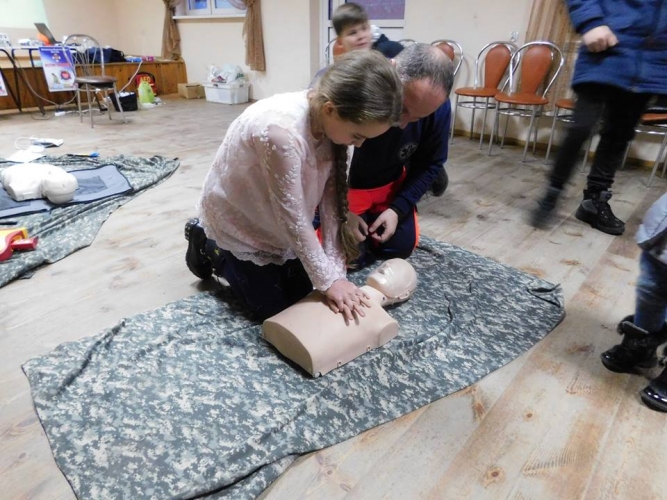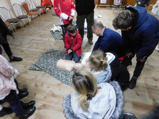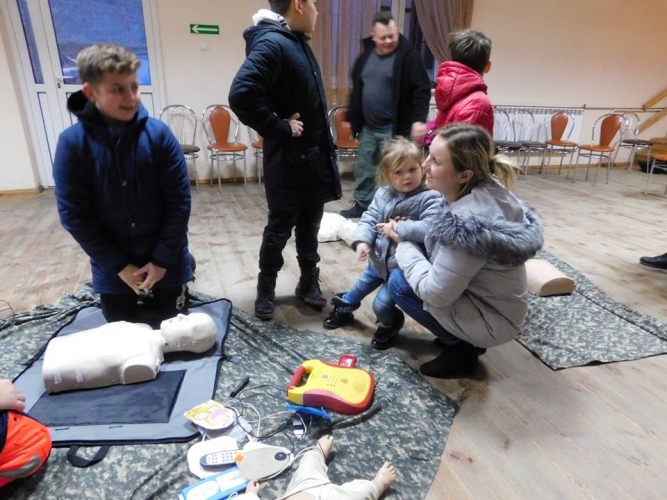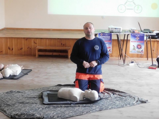Pokaz i szkolenie przedstawił profesjonalny ratownik medyczny Pan Wojciech Gemzała. W spotkaniu ku naszej uciesz wzięło udział 45 osób w tym duża liczba dzieci. To cieszy, że dzieci są zainteresowane tym tematem.