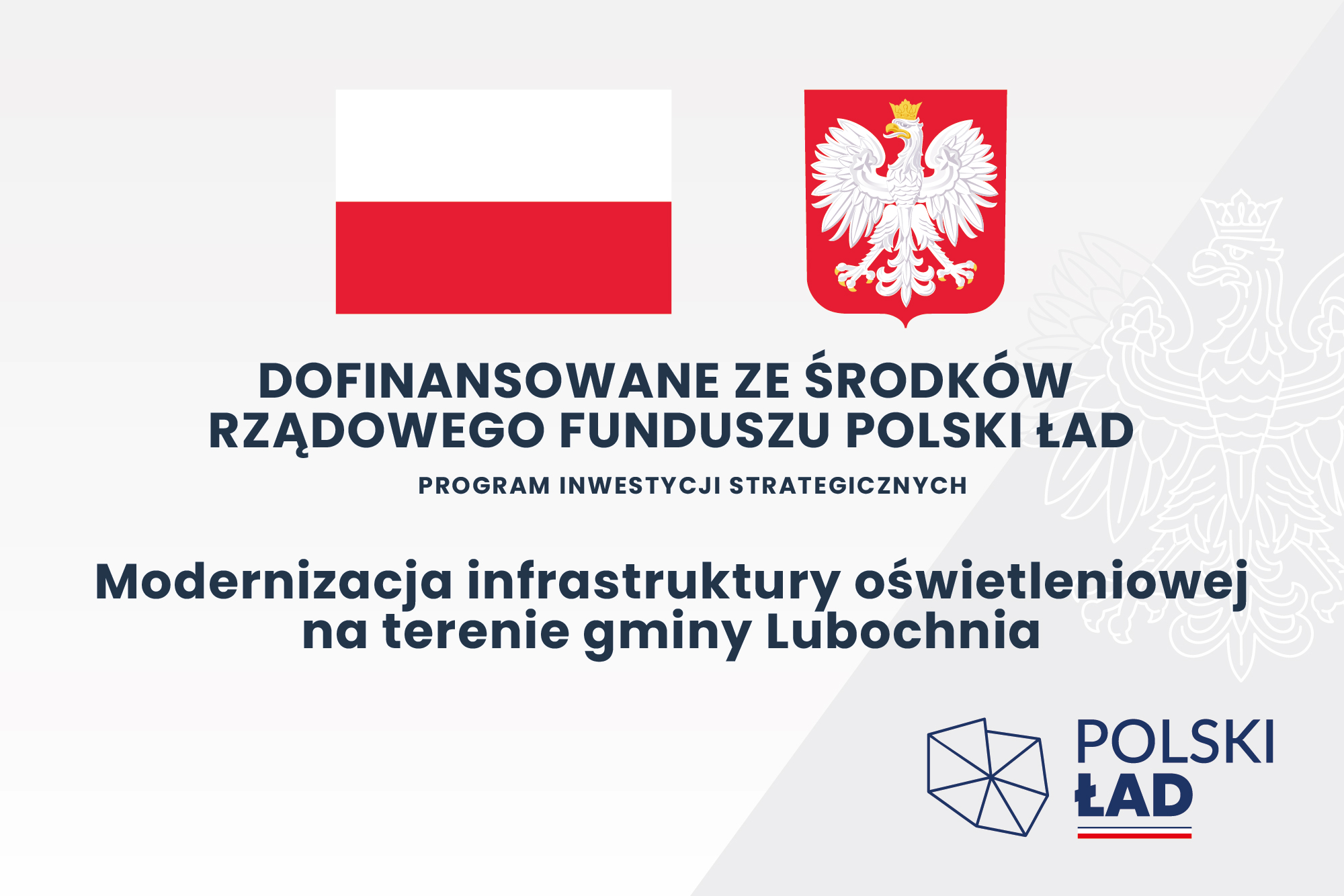 W dniu 4 listopada 2024 r. podpisany został protokół odbioru końcowego dla zrealizowanego zadania inwestycyjnego pn. Modernizacja infrastruktury oświetleniowej na terenie gminy Lubochnia, dofinansowanego ze środków Rządowego Funduszu Polski Ład: Program Inwestycji Strategicznych – edycja 9 Rozświetlamy Polskę, w ramach którego dokonano wymiany istniejących, nieenergooszczędnych opraw oświetleniowych zlokalizowanych na terenie gminy Lubochnia, na energooszczędne oprawy LED. Wykonawcą była firma EL-MOT Usługi Elektryczne Sp. z o.o. z Tuszyna. Całkowita wartość zadania wyniosła 710.905,40 zł brutto, w tym: