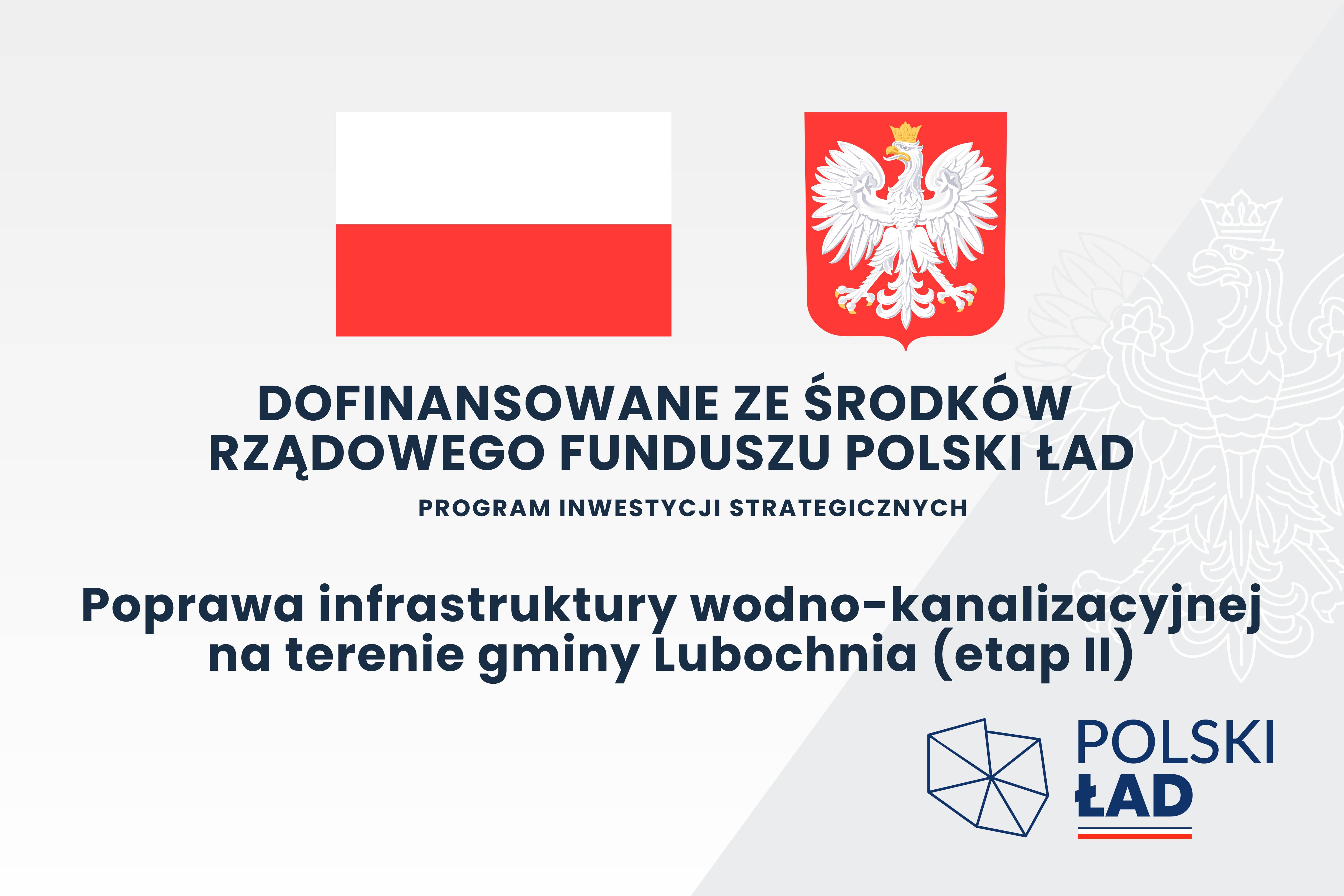 W dniu 12 listopada 2025 r. podpisany został protokół odbioru końcowego dla zrealizowanego zadania inwestycyjnego pn. Poprawa infrastruktury wodno-kanalizacyjnej na terenie gminy Lubochnia (etap II), dofinansowanego ze środków Rządowego Funduszu Polski Ład: Program Inwestycji Strategicznych – edycja 8. Całkowita wartość zadania wyniosła 2.607.625,60 zł brutto, w tym dofinansowanie w kwocie 1.995.000,00 zł. Wykonawcą była firma Binstal Bożena Tchórz z Tomaszowa Mazowieckiego.